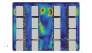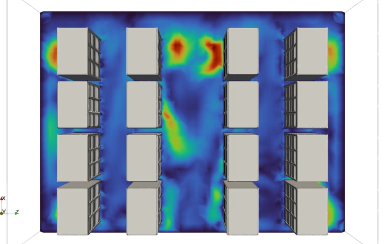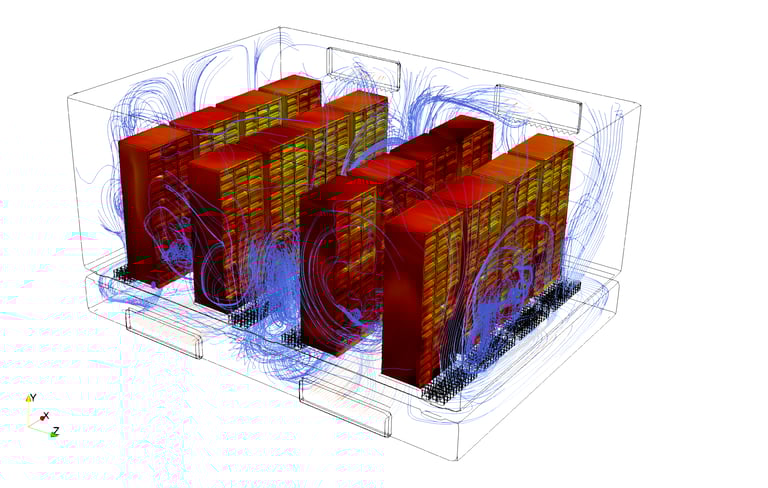 Simulasi CFD memungkinkan evaluasi konfigurasi hot aisle–cold aisle, distribusi udara dari CRAC atau CRAH unit, serta efektivitas sistem raised floor. Dengan analisis ini, area dengan sirkulasi udara yang kurang optimal dapat diidentifikasi sehingga penataan rack, penempatan ventilasi, atau konfigurasi sistem pendinginan dapat diperbaiki.